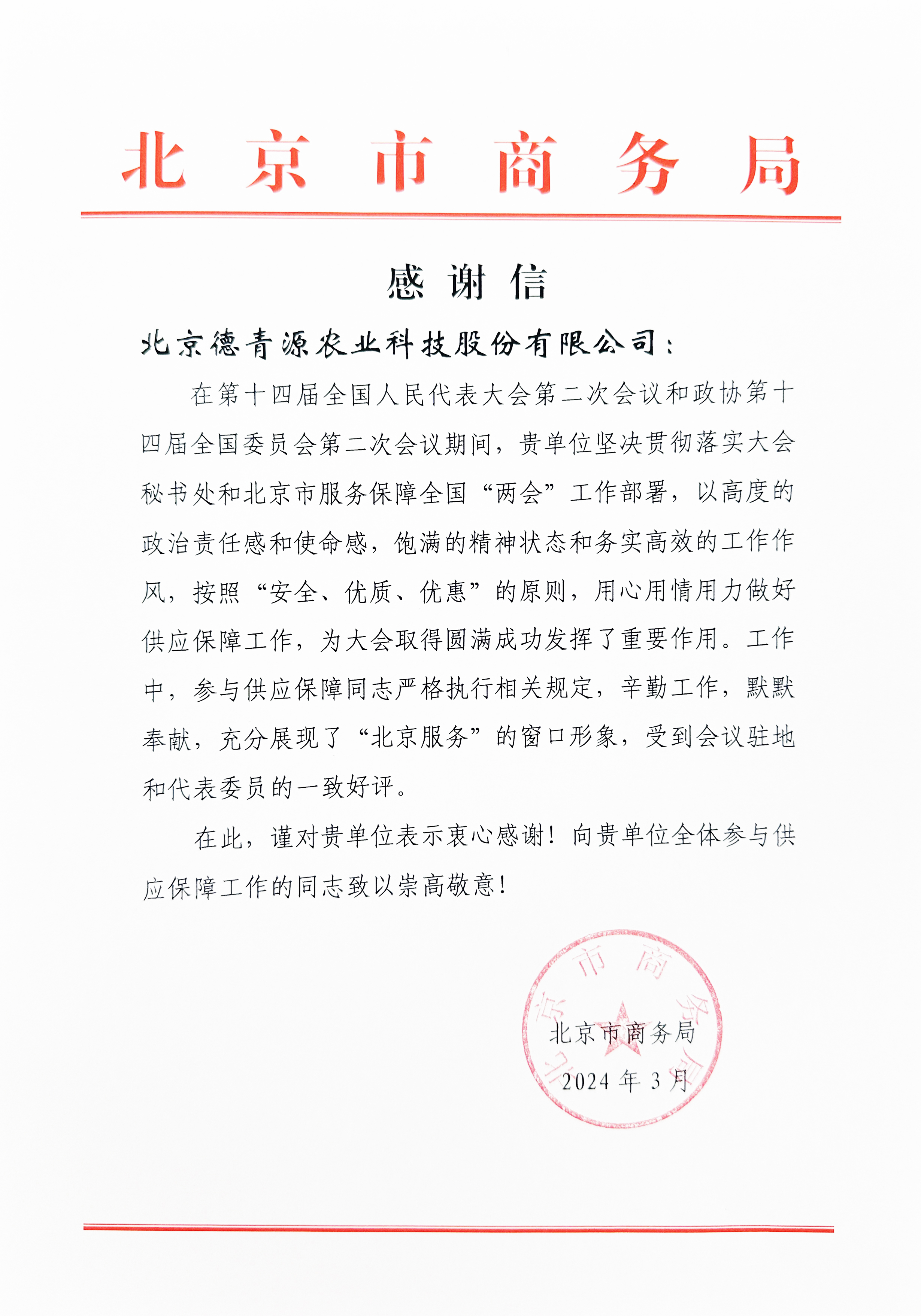 近日,德青源收到了北京市商務(wù)局發(fā)來的感謝信,對(duì)德青源為第十四屆全國人民代表大會(huì)第二次會(huì)議和政協(xié)第十四屆全國委員會(huì)第二次會(huì)議期間做出的保障工作給予了高度評(píng)價(jià)